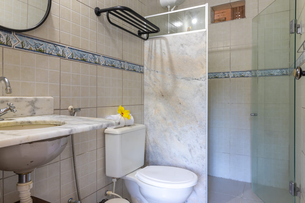 Descrição Geral: Esta suíte oferece uma vista encantadora do jardim e conta com piso frio/em mármore, proporcionando uma sensação de frescor. Equipada com ar-condicionado, TV a cabo e frigobar, a suíte oferece todas as conveniências necessárias para uma estadia confortável. O banheiro privativo inclui um chuveiro, complementando a experiência de bem-estar no espaço.