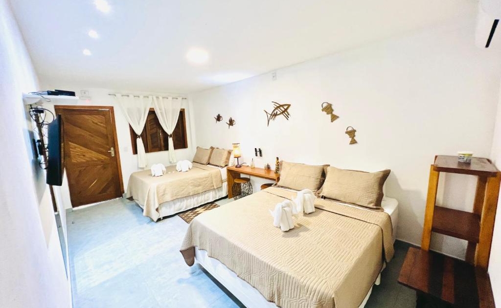 Os quartos da pousada são aconchegantes, com maioria deles com uma varanda que apresenta vista parcial do mar, criando um cenário perfeito para relaxar. As comodidades incluem SmartTV, TV a cabo, ar-condicionado e frigobar, tudo projetado para garantir o conforto dos hóspedes.