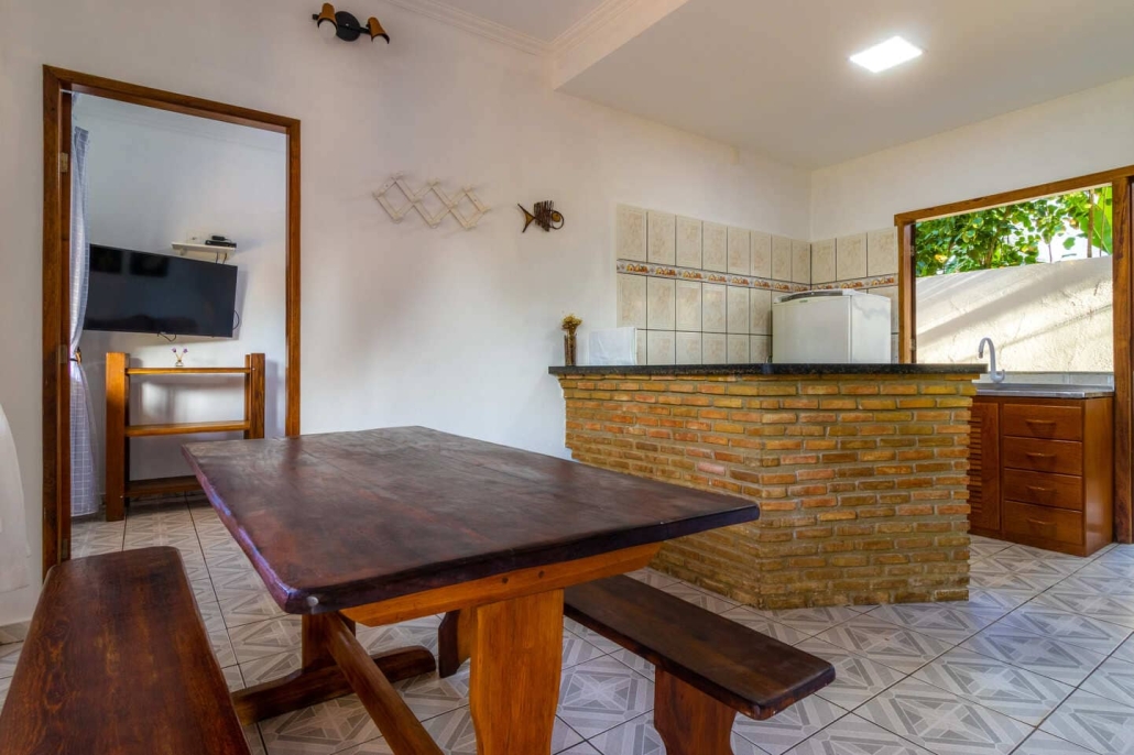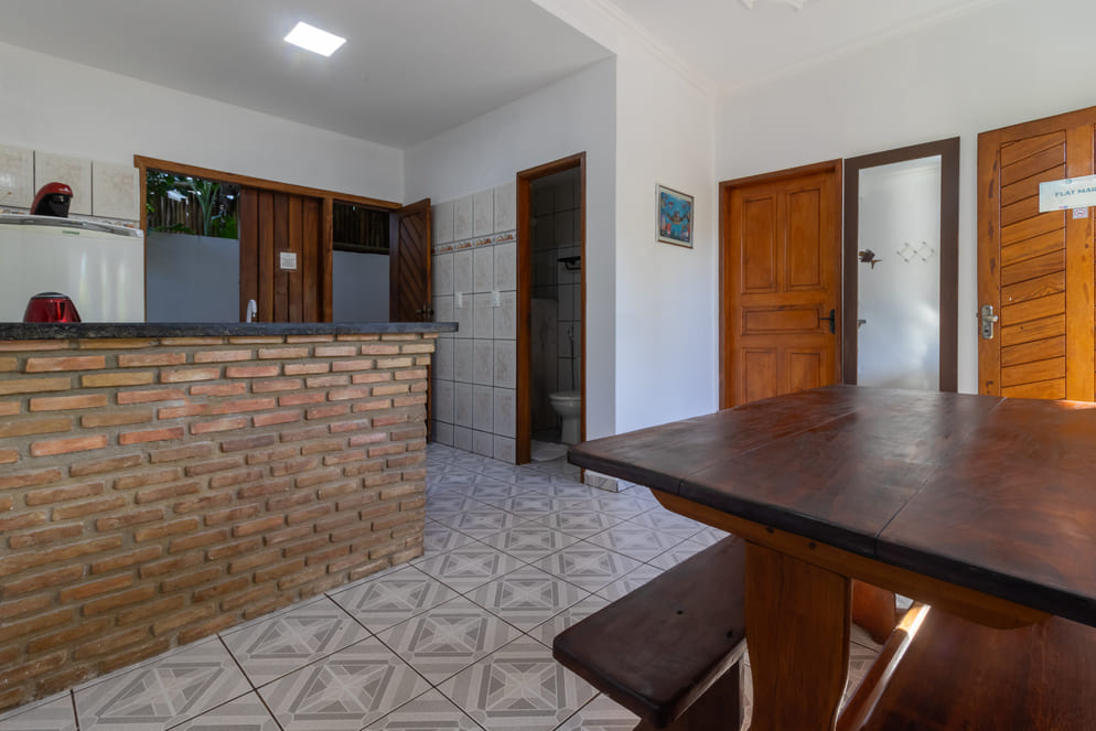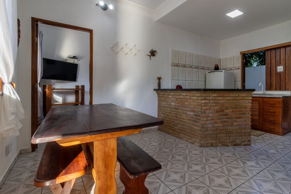 Conta com uma cozinha americana equipada com fogão, geladeira, utensílios básicos e máquina de café — perfeita para preparar suas delícias favoritas, do jeitinho de casa.