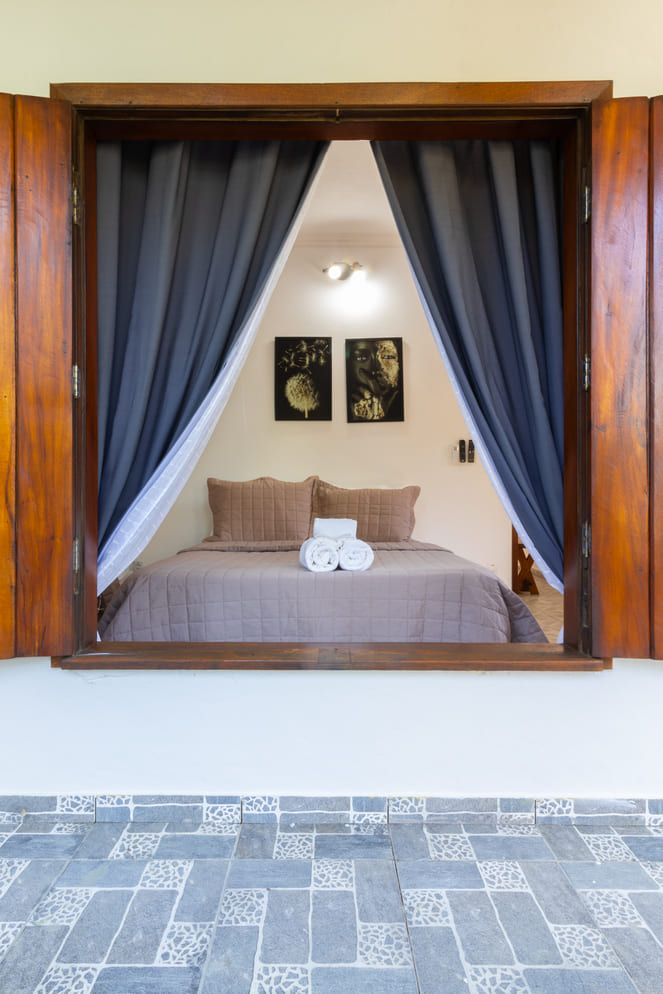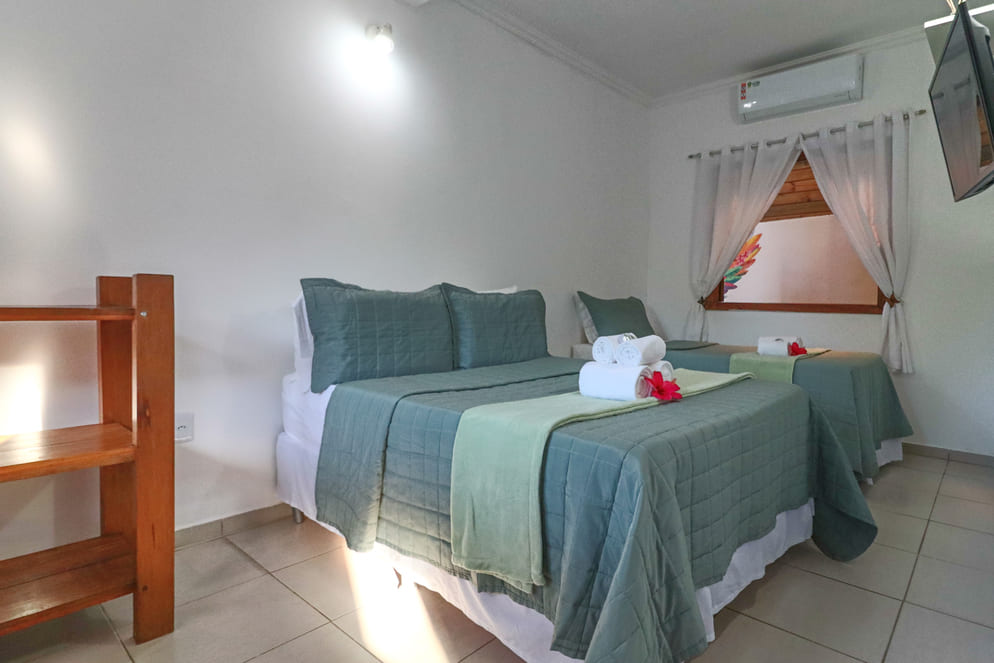 O quarto climatizado é acolhedor, com Smart TV com canais a cabo, área para refeições e um banheiro privativo com chuveiro, trazendo tudo o que você precisa para uma estadia leve e especial.