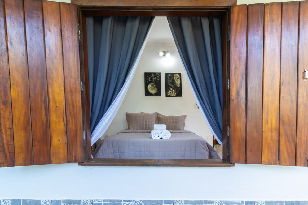 Na varanda, a natureza dá o espetáculo: o jardim emoldura o cenário e o mar aparece de forma delicada, como quem chega só pra desejar bons sonhos.