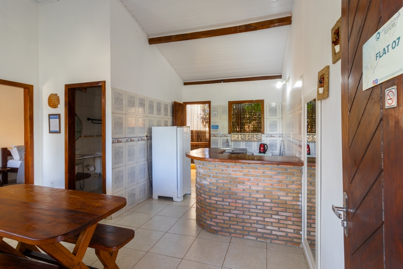 Com uma cozinha americana equipada (fogão, geladeira e utensílios básicos), máquina de café e área para refeições, o flat oferece praticidade e carinho em cada detalhe.