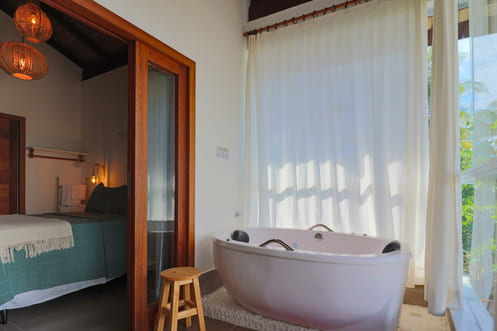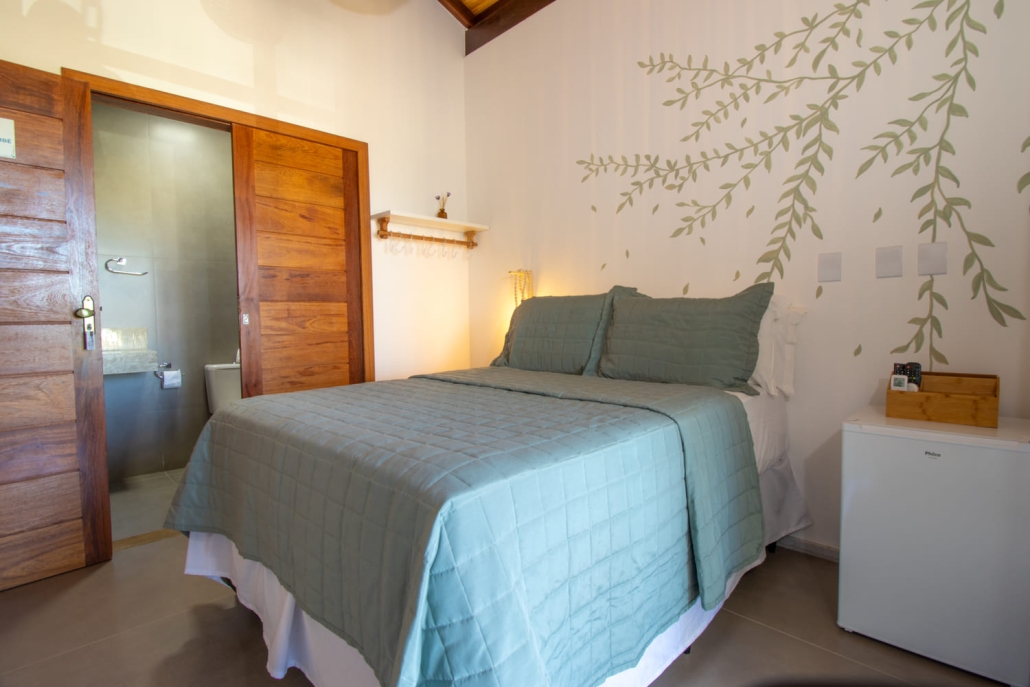 A Suíte Master Cachoeira do Tremembé é um espaço compacto e charmoso, ideal para casais que buscam tranquilidade com um toque especial. A varanda privativa oferece uma linda vista para o jardim da pousada e uma porção do mar ao fundo, criando um clima único de relaxamento.