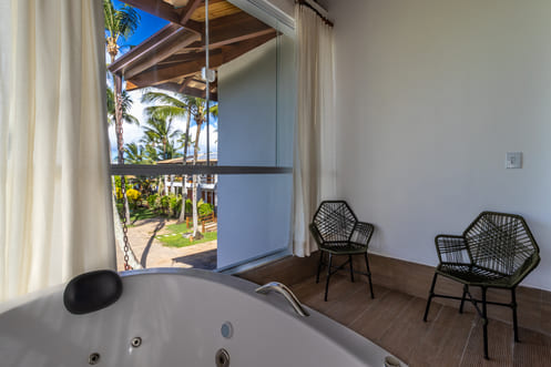 Varanda privativa com banheira de hidromassagem.
