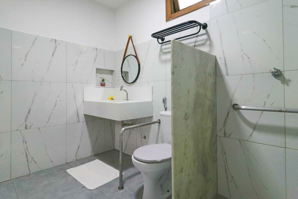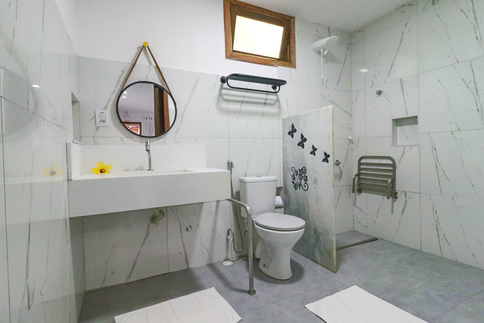 Localizada no térreo, é ideal para hóspedes com mobilidade reduzida, oferecendo um ambiente seguro, funcional e adaptado para facilitar o acesso.