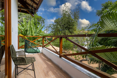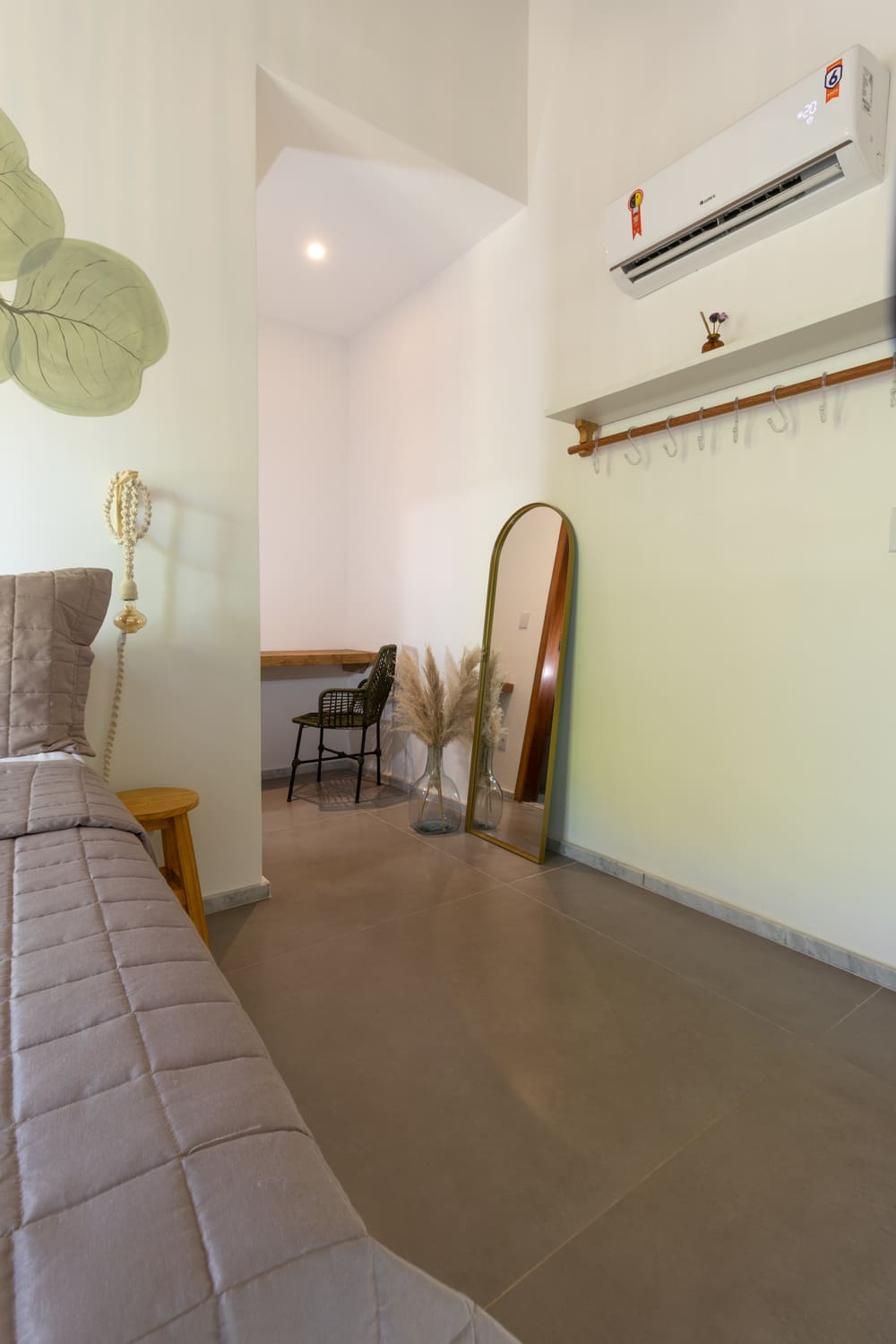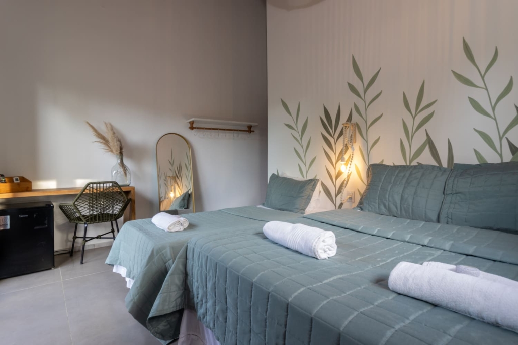O espaço conta com ar-condicionado, Smart TV com canais a cabo, frigobar e um banheiro privativo com chuveiro. Na varanda privativa, a vista para a rua da pousada e a horta traz aquele charme simples e sereno que acolhe.